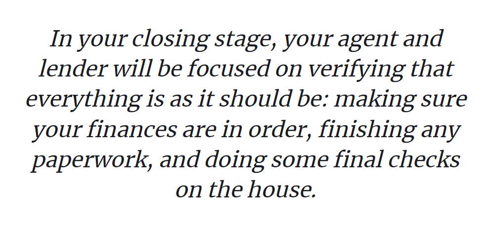 Even though the final stage of the homebuying process can let loose a lot of feelings, it is really all about checking off boxes. In your closing stage, your agent and lender will be focused on verifying that everything is as it should be: making sure your finances are in order, finishing any paperwork, and doing some final checks on the house. They will also confirm the home’s value and legal status with the lender, which includes a survey, appraisal, title search, and a final check of your credit and finances.